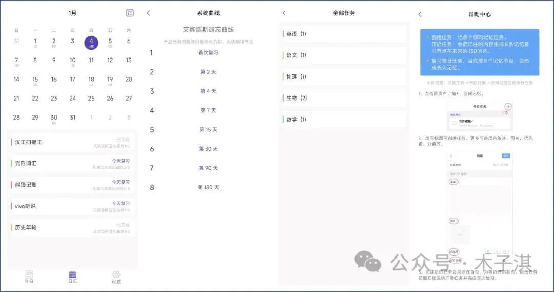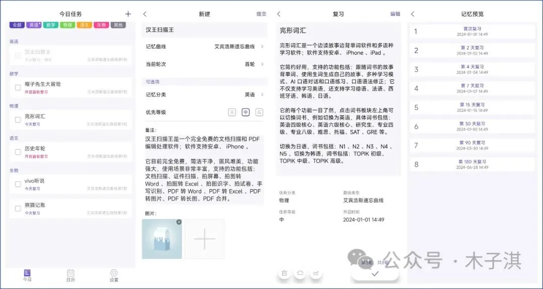 它支持今日任务板块,清晰展示每天需要学习复习的内容,点击任意内容就可以开始学习复习;它支持记忆预览功能,每个任务的所有复习时间一目了然。
