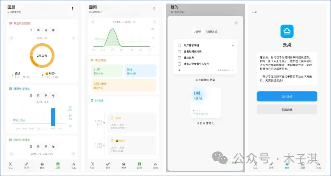 它支持的功能包括:番茄钟、待办清单、云桌,其中云桌功能支持与同伴共同成长,共同进行专注,支持实时查看同伴专注进度和跟踪待办的进展。