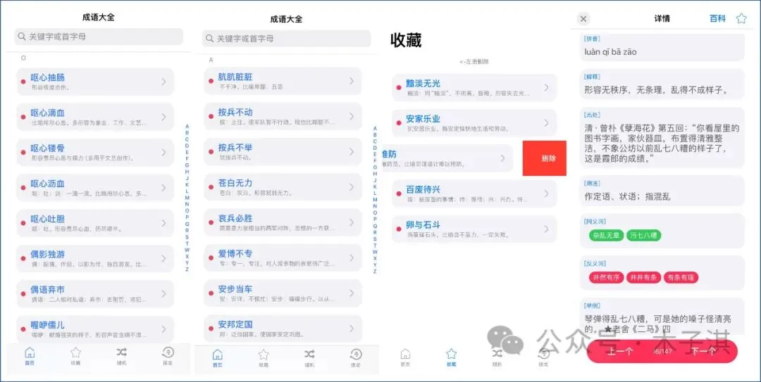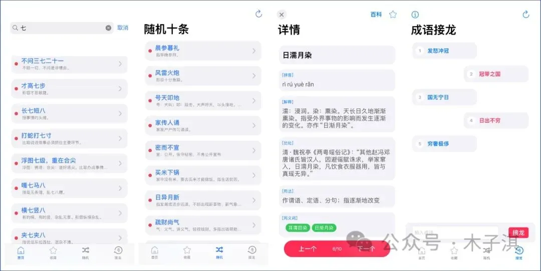 随机成语支持随机展示 10 条成语,成语接龙支持成语接龙提示,成语收藏支持左滑删除。
