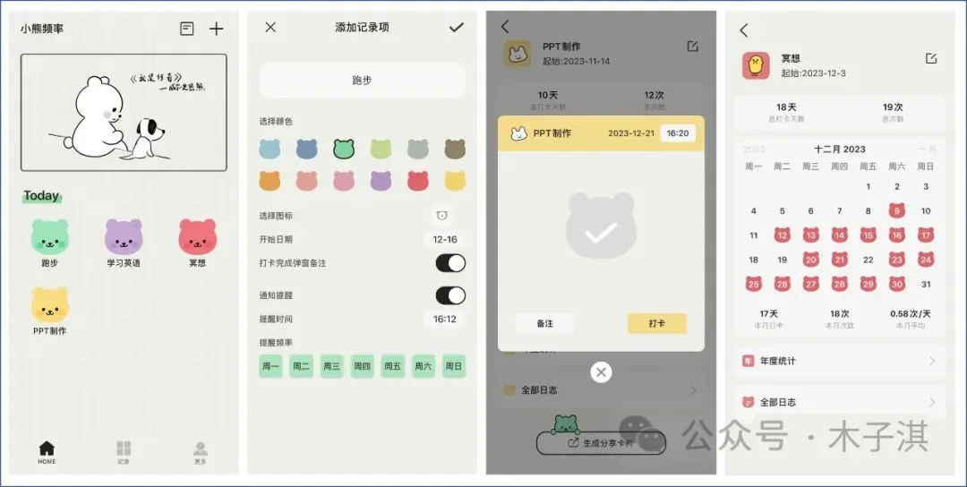 它界面好看,小清新风格,颜值很高,呆萌的小熊陪着你成长,首页的小熊会有不同的状态和插画展示;点击加号按钮可以添加习惯,包括:习惯名称、习惯颜色、习惯图标、开始日期、打卡完成备注、通知提醒、提醒时间、提醒频率。