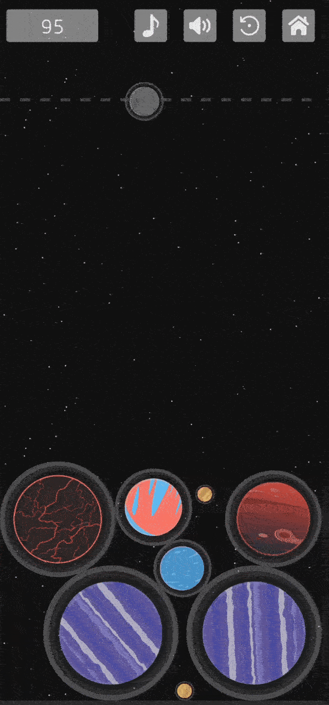 它没有网络也可以试玩,打开软件就知道怎么操作,相同的星球可以进行合成,一个星球掉落,会撞击合成星球,也会影响到其它星球,其它星球可能会移动合成。