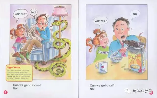 比如第1页,女儿问,“Can we get a snake?”