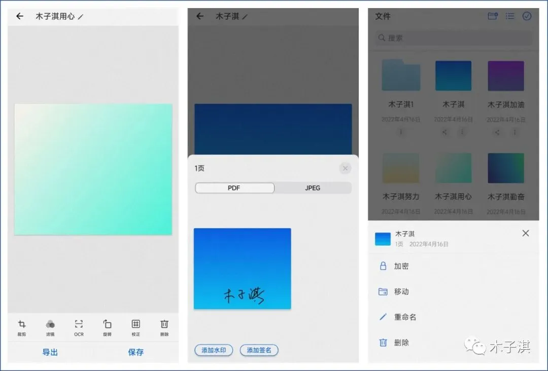 它支持实用的导出功能,支持以 PDF 和 JPEG 格式导出扫描文件,支持添加签名、移除水印。