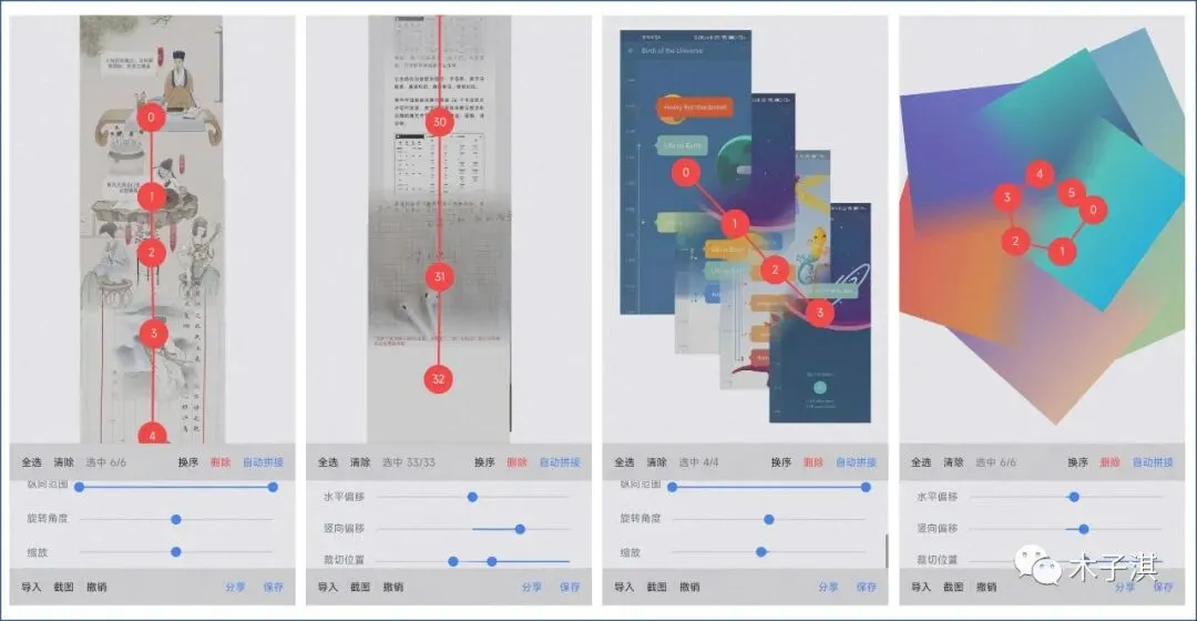 它还支持的功能包括:全选图片、清除选中图片、两张图片更换顺序和位置、自动拼接图片。