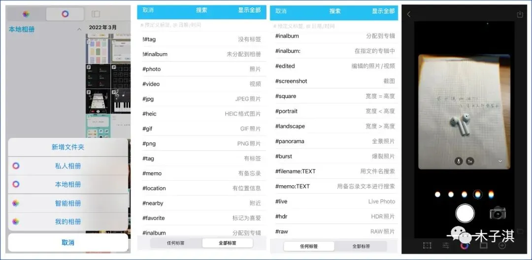 它支持给每张照片添加备忘录,支持给每张照片添加标签,支持强大的照片搜索功能,包括:按照标签、按照备忘录文本、按照日期时间、宽度等于高度、宽度小于高度、宽度大于高度、全景照片、有位置信息、PNG 格式照片、GIF 格式照片、HEIC 格式照片等,并且支持快速搜索特定内容。