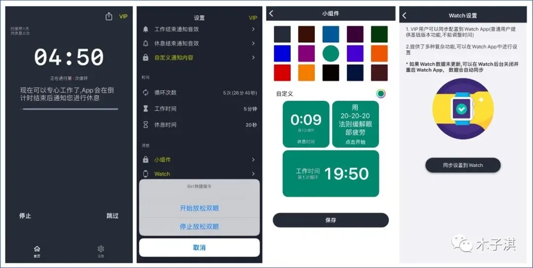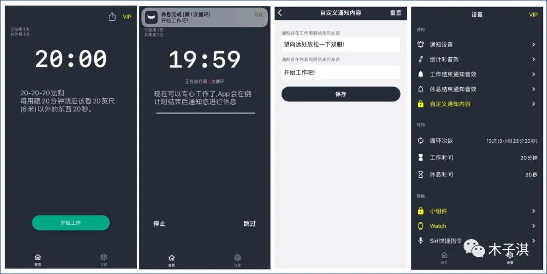 它支持丰富的设置选项,包括:通知设置、倒计时音效、工作结束通知音效、休息结束通知音效、自定义通知内容、时间设置、小组件设置等。