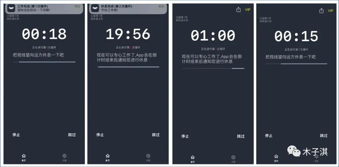 设置完成,点击开始工作按钮就开始倒计时,你可以去专心工作,然后软件会在倒计时结束后通知你进行休息,你也可以点击停止和跳过按钮。