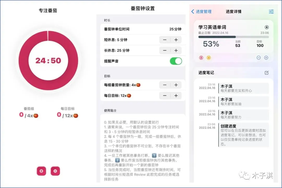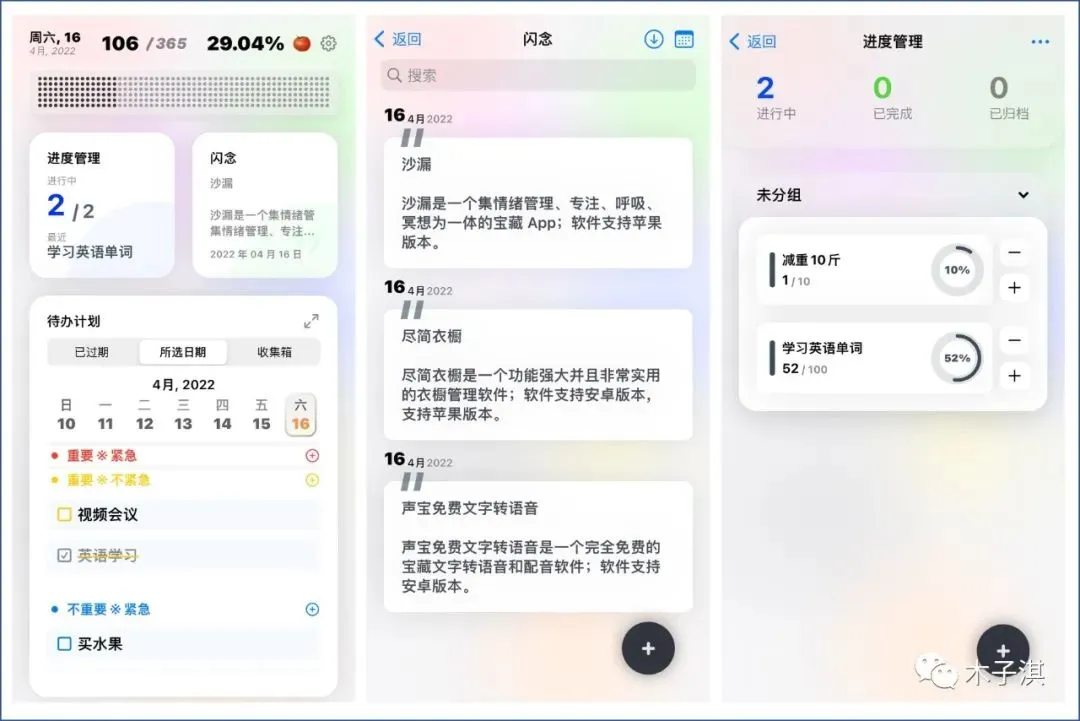 它支持的功能全面丰富,包括:年进度、进度管理、闪念笔记、专注番茄、待办计划、四象限展示待办等,一个软件相当于多个软件。