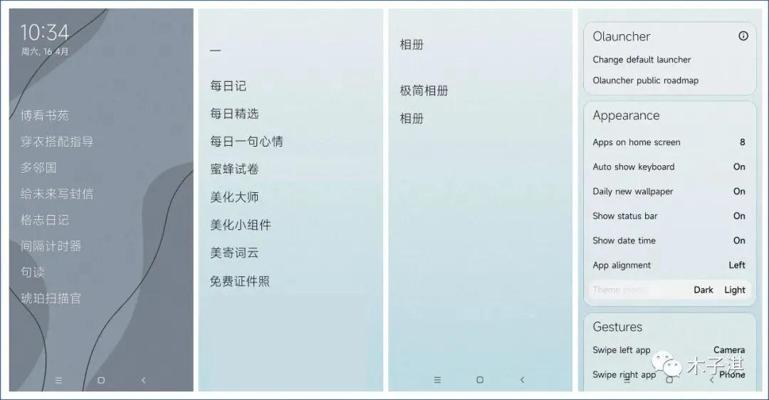 它支持强大的外观设置,主界面可以选择展示几个应用的名称,最多数量是 8 个,支持应用名称左边展示、居中展示、右边展示,主界面支持展示时间和日期,还支持亮暗 2 种主题,每日壁纸等设置选项。