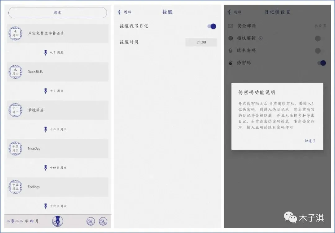 它支持按照时间轴写日记,支持随时随地离线写日记,支持设置时间提醒你写日记。