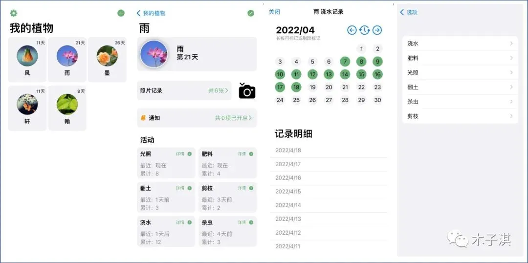 其中活动包括:浇水、肥料、光照、翻土、杀虫、剪枝等,当然也可以自定义新增活动。