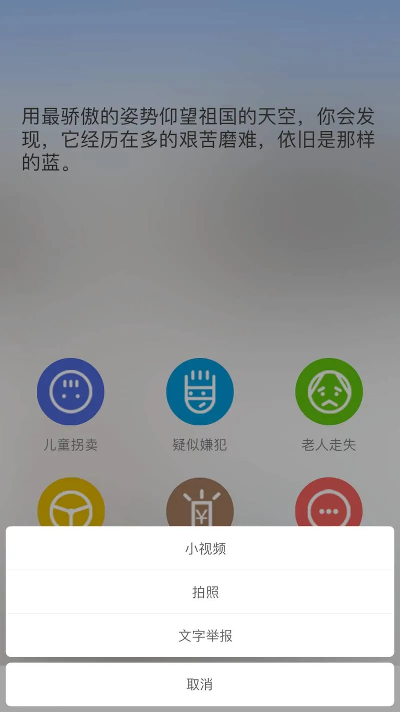 “一个集成及警民合作、按键下发、群众上传的平台,公安民警联合民间力量,对一些按键进行线索搜集,并且同时得到一些可疑情况的举报,为社会治安,城市发展,人民群众的生命财产安全提供更加全面的信息化共享服务”