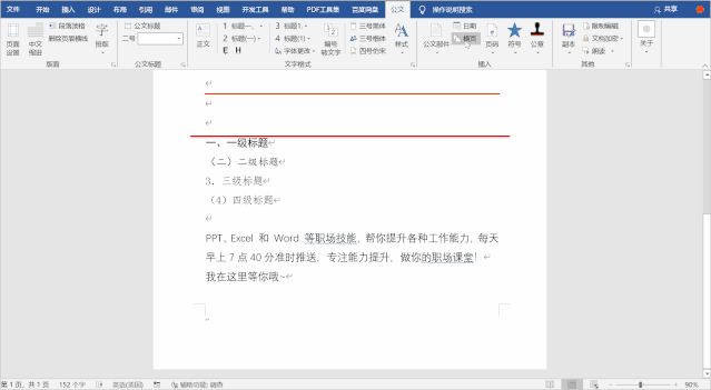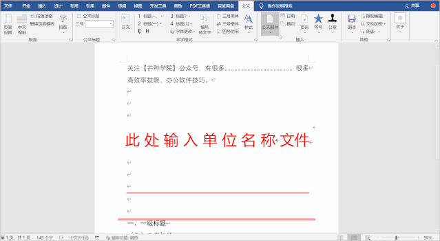 既然是公文排版插件,那么肯定要分享一些在公文中排版所用到的技巧,在「插入」分组中提供了非常多的公文部件。