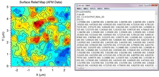 使用RSoft CAD汇入数据的方法,可接受的数据格式是以「ASC-II」格式为主的数据格式,一般常见的量测方法为AFM等显微镜影像。图 1是本文中所使用的AFM数据与其绘图,主要用于在RSoft CAD中设定表面的粗糙度(Height Profile)。