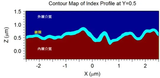 一般案例中,使用者可以利用RSoft CAD的Coating Utility加入镀膜的材料与设定。图 3是在上述的案例中加入镀膜的结构横切面,用户可以利用Coating Utility根据现有结构再加入一定厚度的镀膜: