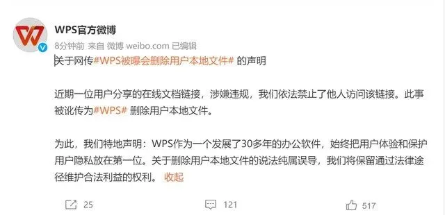 “近期一位用户分享的在线文档链接,涉嫌违规,我们依法禁止了他人访问该链接。此事被讹传为#WPS#删除用户本地文件。为此,我们特地声明:WPS作为一个发展了30多年的办公软件,始终把用户体验和保护用户隐私放在第一位。关于删除用户本地文件的说法纯属误导,我们将保留通过法律途径维护合法利益的权利。”