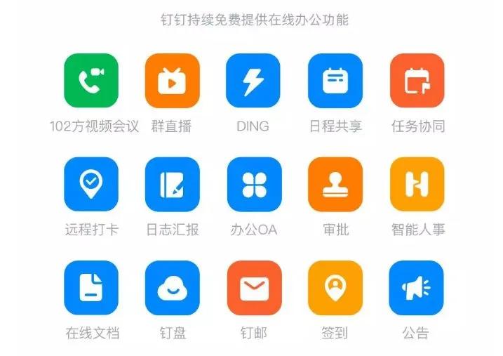 主功能包括远程视频会议、方便教育机构和学校使用的群直播、保障企业组织疫情期间消息精准触达的DING功能、保障组织分散办公效率的日程共享、任务协同、在线文档协同、远程打卡功能,还有日志汇报、办公OA、审批、智能人事、钉盘、钉邮、公告、签到、项目群等网上办公基础功能,全量免费开放。
