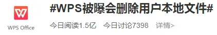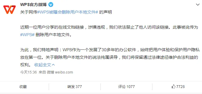 随后,@WPS 官方微博 回应称,该说法纯属误导,系一位用户分享的在线文档链接,涉嫌违规,我们依法禁止了他人访问该链接。此事被讹传为WPS删除用户本地文件。官方还强调,WPS 作为一个发展了 30 多年的办公软件,始终把用户体验和保护用户隐私放在第一位。