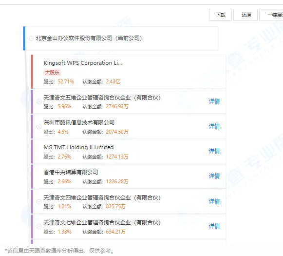 2022年一季报显示,小米科技有限责任公司为其关联公司。另外,Kingsoft WPS Corporation Limited为金山办公第一大股东,持股2.43亿股,占比52.71%。