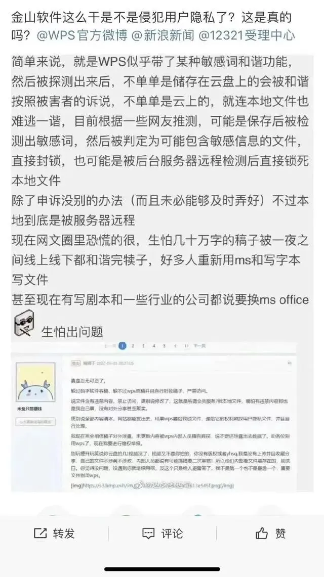 事情的起因是一名用户质疑WPS因敏感词删除本地文件。监听、偷窥、私自执法,向来是网友们的“逆鳞”,再加上11年前,金山就陷入了“泄密门”,又增加了一层不信任感。