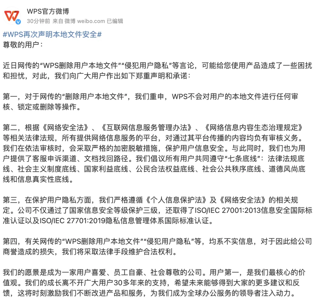 第一,对于网传的“删除用户本地文件”,我们重申,WPS不会对用户的本地文件进行任何审核、锁定或删除等操作。