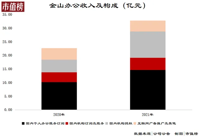 根据服务对象和服务方式的不同,金山办公将收入划分为四个来源:个人办公服务订阅业务、国内机构订阅及服务业务、国内机构授权业务和互联网广告推广服务业务。