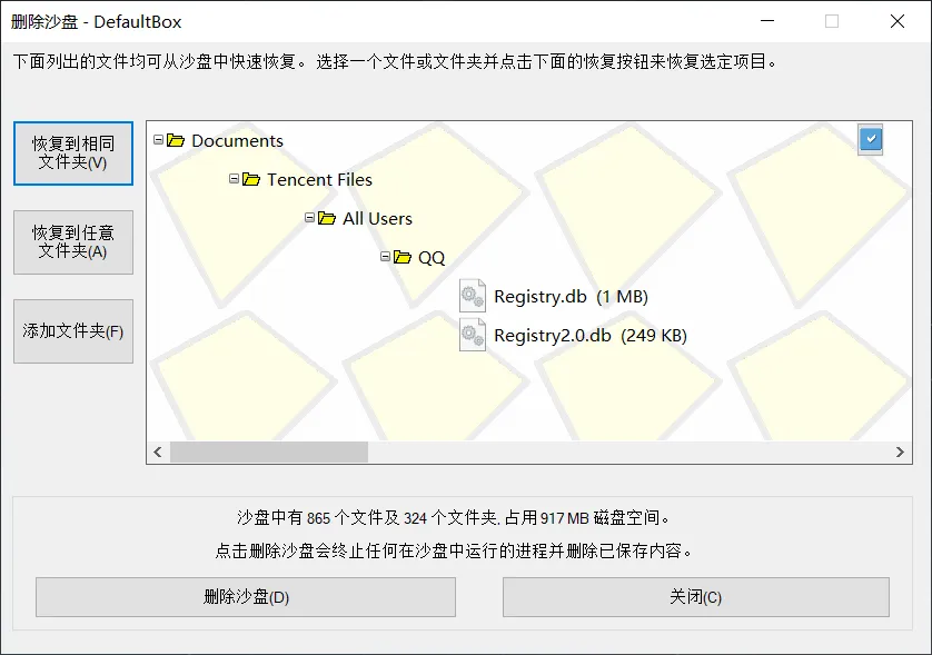 软件使用完毕,差友们还可以选择把这些缓存文件恢复到真实的系统中,或者删除所有保存在沙盘里的文件,以此来避免电脑中毒和保护隐私。