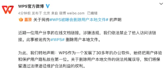 @WPS官方微博 发文,回应“WPS被曝会删除用户本地文件”一事,称一位用户分享的在线文档链接,涉嫌违规,我们依法禁止了他人访问该链接。此事被讹传为WPS删除用户本地文件。