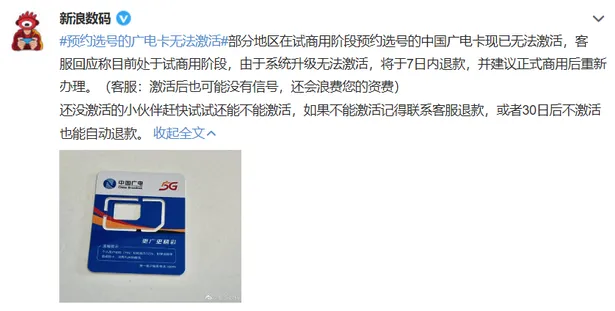 据报道,部分地区在试商用阶段预约选号的中国广电卡现已无法激活。对此,客服回应称目前处于试商用阶段,由于系统升级无法激活,将于7日内退款,并建议正式商用后重新办理。同时客服还强调:激活后也可能没有信号,还会浪费您的资费。