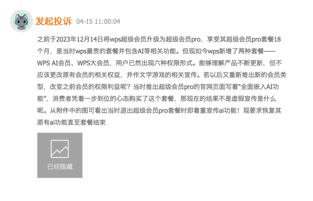 四川的陈先生是WPS办公软件的资深用户,此前购买了超级会员。他反映称,自己买的时候,超级会员就是WPS的最高等级会员,当时WPS称AI功能上线后为超级会员权益,后来又改为体验功能,还新出了大会员,把AI功能放入大会员。