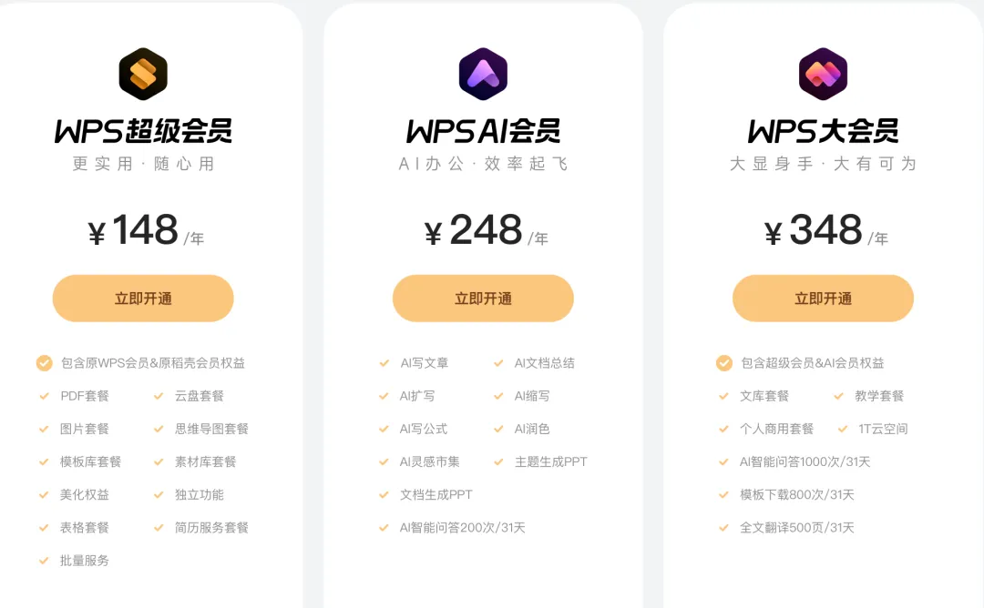 对于会员体系复杂的问题,WPS工作人员表示,WPS全新的会员体系正在灰度测试中,共有3种会员:WPS超级会员、WPS AI会员和WPS大会员。
