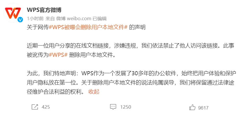WPS否认删除用户本地文件;河南安徽对村镇银行客户先行垫付;许家印鼓励员工积极卖车;电视台回应《谭谈交通》下架丨邦早报