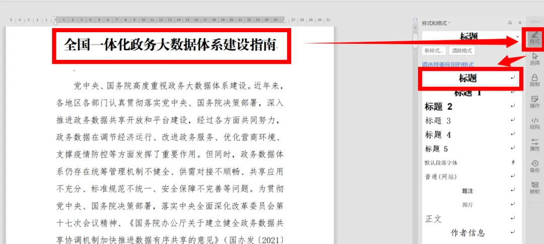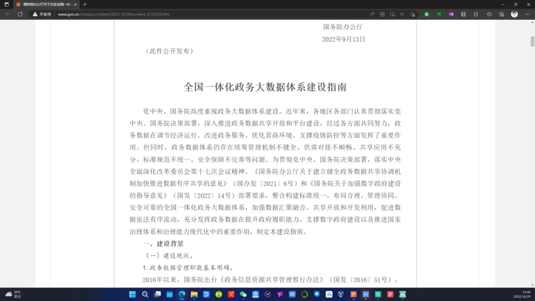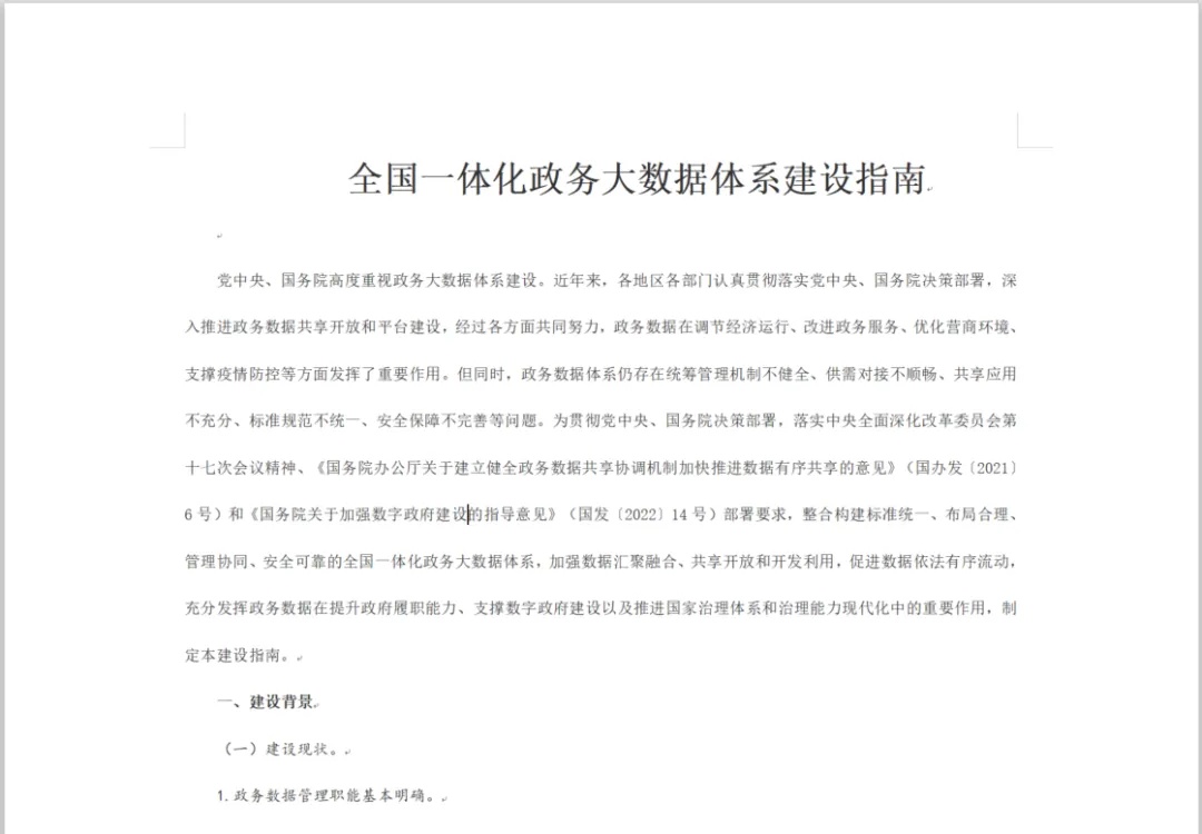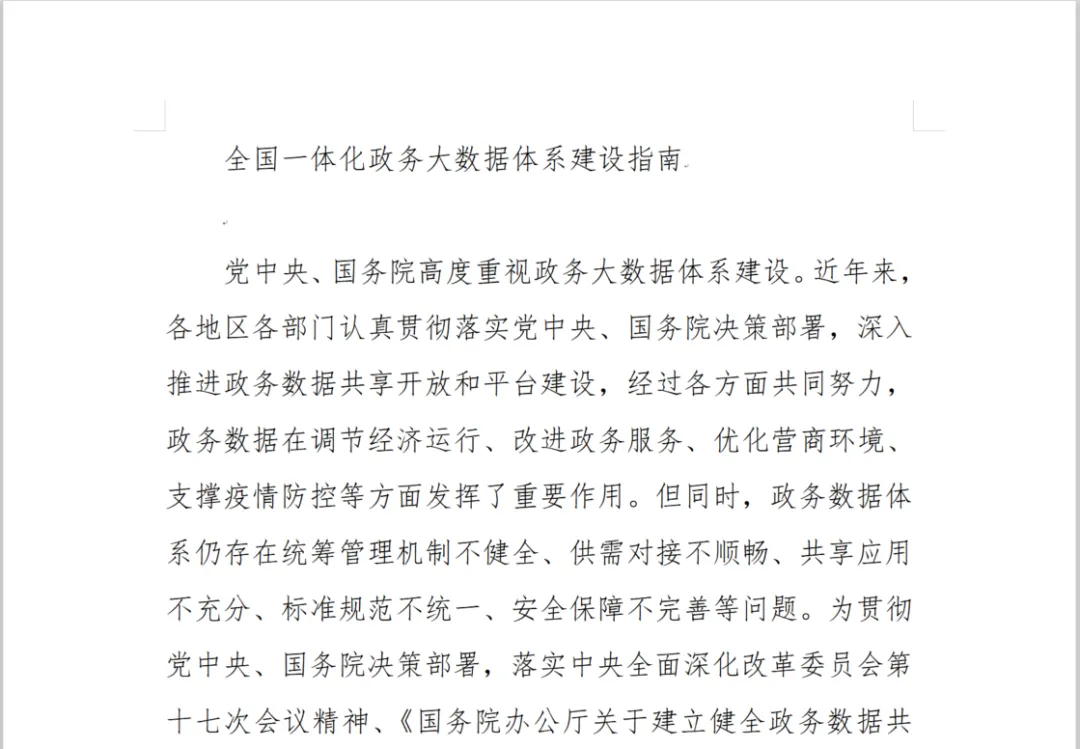 首先我们需要准备一篇用来复制的篇幅较长的文章(这里我们选择国务院网站上公开发布的《全国一体化政务大数据体系建设指南》),以及一个WPS文字软件的空白文档。