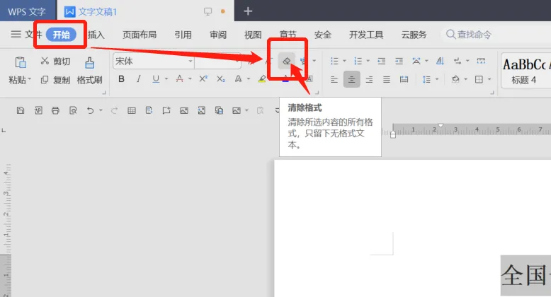 第二步,在WPS文档页面,同时按住Ctrl+A,全选文档中所有内容,然后点击“开始”功能,选择“清除格式”。