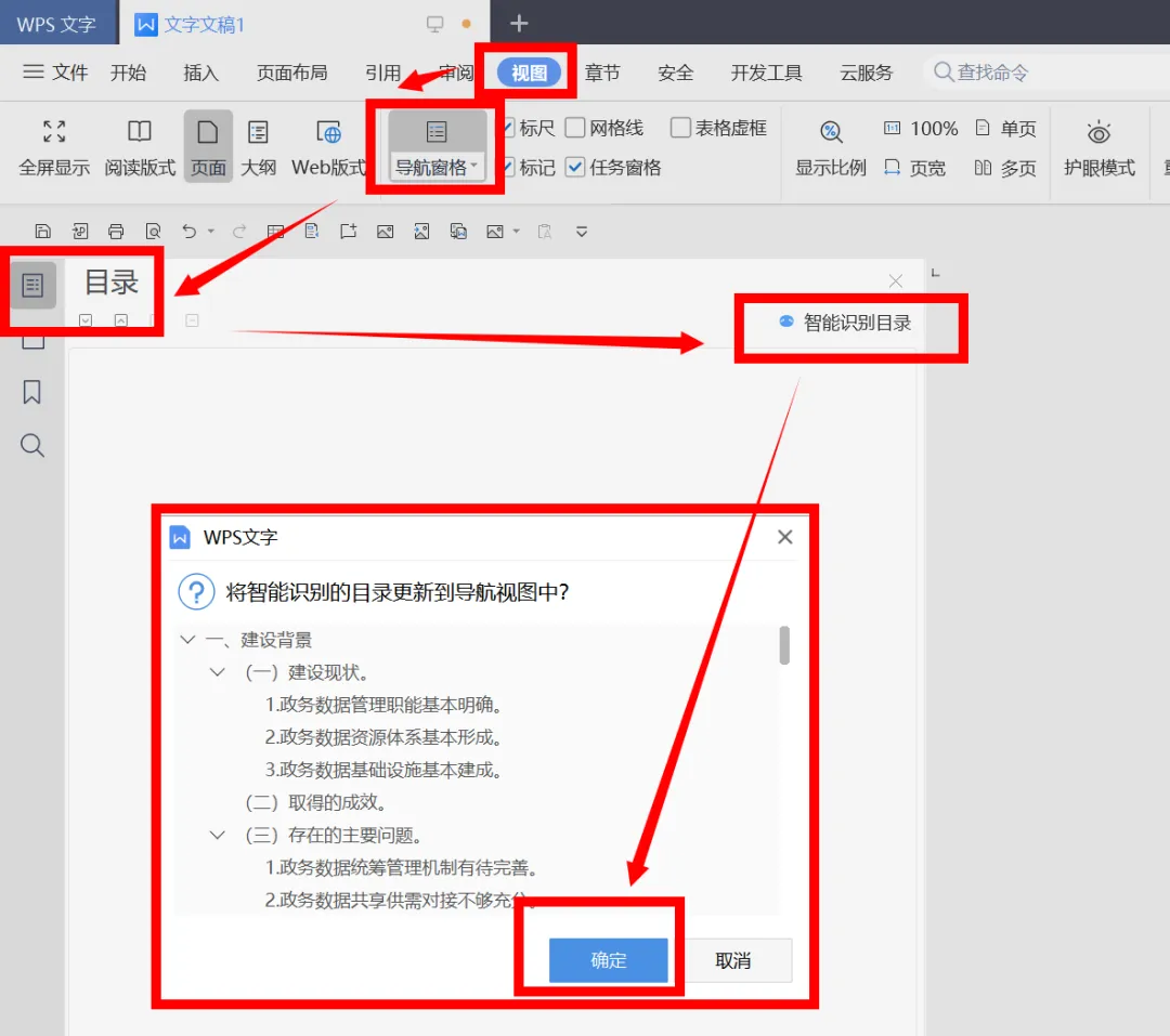 第三步,激活“视图”功能选项卡,选择“导航窗格”,使其显示在文章左侧,并选择显示“目录”内容。此时点击“目录”右侧的“智能识别目录”按钮,在智能识别框中点击“确定”按钮,完成文章目录的提取。