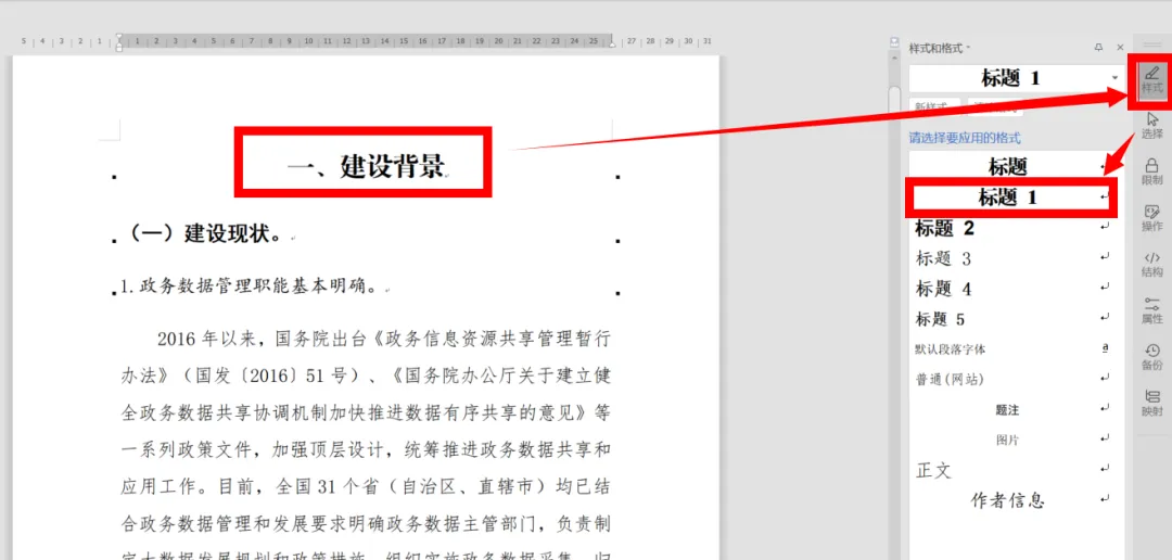 第四步,只要按照“一级标题”“二级标题”和“三级标题”的顺序完成格式的设置。先用“导航窗格”定位到第一个一级标题,选择“开始”功能选项卡中的“样式”功能区,选择“标题1”样式,然后定位到第二个一级标题,按键盘上的“F4”键,重复这一操作,直到完成所有的一级标题样式的设置。