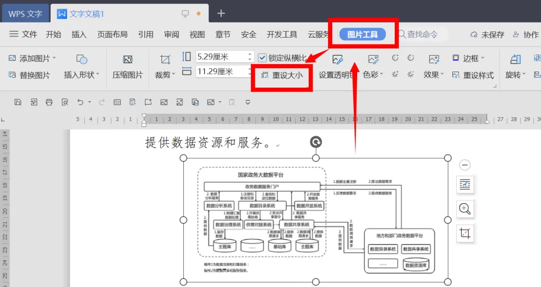 第六步,统一图片的宽度。仿照第五步操作,定位到第一张图片。在“图片工具”中点击“重设大小”按钮。重复这一操作,直到完成所有的图片设置。