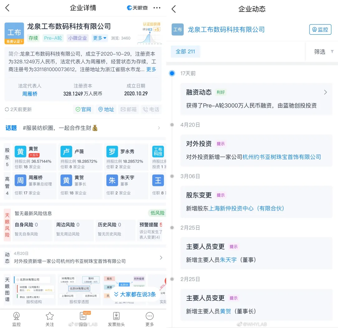 天眼查APP显示,拥有「Thin Red Line」这个商标的公司名叫龙泉工布数码科技有限公司,大股东黄贺(交个朋友总经理),此外还有罗老师的兄弟罗永秀持股,自有品牌“什么马”,还投资了“重新加载”品牌。这家公司 17 天前拿到了蓝驰创投的 3000 万 Per-A 轮融资。
