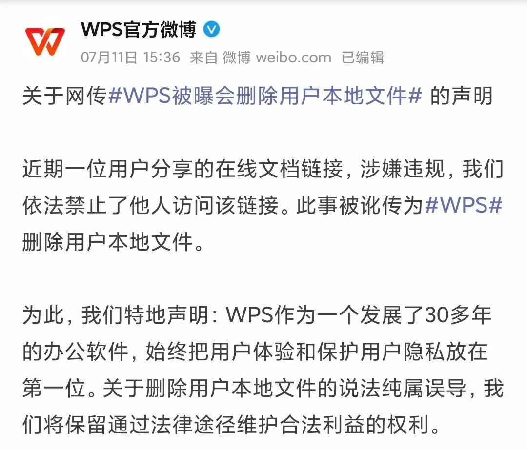 随后,WPS官方回应称,系一位用户分享的在线文档链接,涉嫌违规,WPS依法禁止了他人访问该链接。此事被讹传为WPS删除用户本地文件。为此,WPS在公告中声明:WPS作为一个发展了30多年的办公软件,始终把用户体验和保护用户隐私放在第一位。关于删除用户本地文件的说法纯属误导,我们将保留通过法律途径维护合法利益的权利。