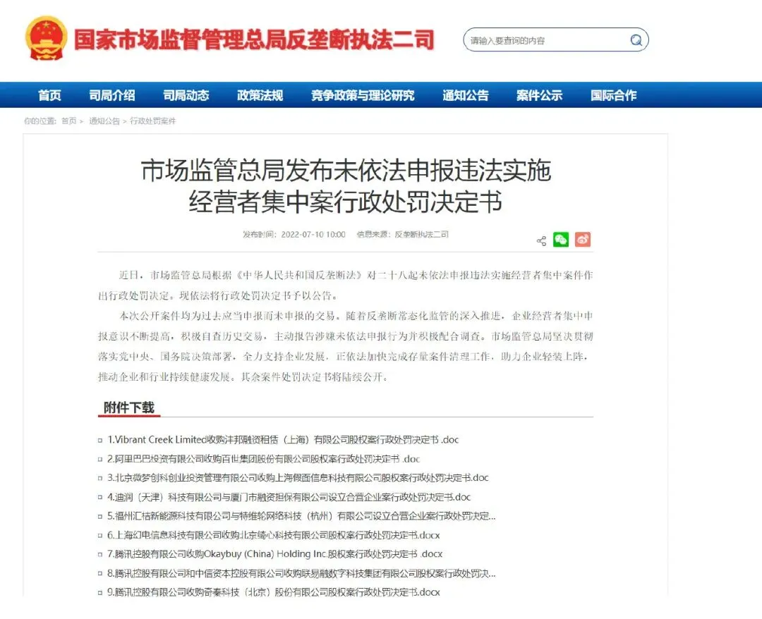 (凤凰网科技报道)近日,市场监管总局根据《中华人民共和国反垄断法》对二十八起未依法申报违法实施经营者集中案件作出行政处罚决定。现依法将行政处罚决定书予以公告。