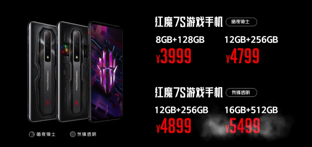 (WHYLAB报道)昨日,红魔 7S 系列游戏手机发布,价格方面,红魔 7S 暗夜骑士版,8+128GB 售价 3999 元、12+256GB 售价 4799 元;氘锋透明版,12+256GB 售价 4899 元、16+512GB 售价 5499 元。