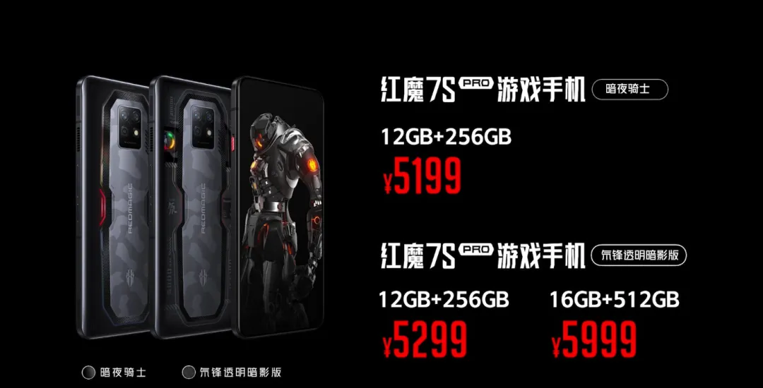 红魔 7S Pro 暗夜骑士版 12+256GB 售价 5199 元;氘锋透明暗影版 12+256GB 售价 5299 元、16+512GB 售价 5999 元;氘锋透明银翼版 12+256GB 售价 5299 元、16+512GB 售价 5999 元;变形金钢大黄蜂限量典藏版 16+512GB 售价 6499 元;