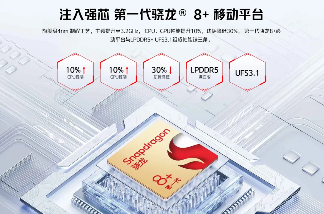 – 芯片:骁龙 8+ 处理器,LPDDR5 内存,UFS 3.1 闪存,支持最大 6GB 运存扩展,Magic GPU 自研稳帧引擎