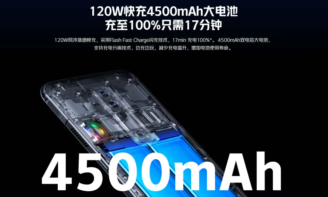 – 续航:4500mAh 双电芯电池,支持 120W 快充,17 分钟充电 100%,标配 165W 氮化镓充电头