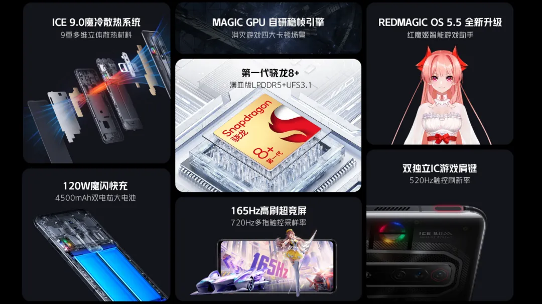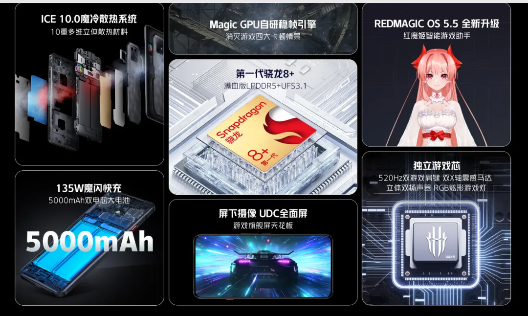– 芯片:骁龙 8+ 处理器,红芯 1 号独立游戏芯片(红魔联合艾为研发),LPDDR5 内存,UFS 3.1 闪存,支持最大 6GB 运存扩展,Magic GPU 自研稳帧引擎