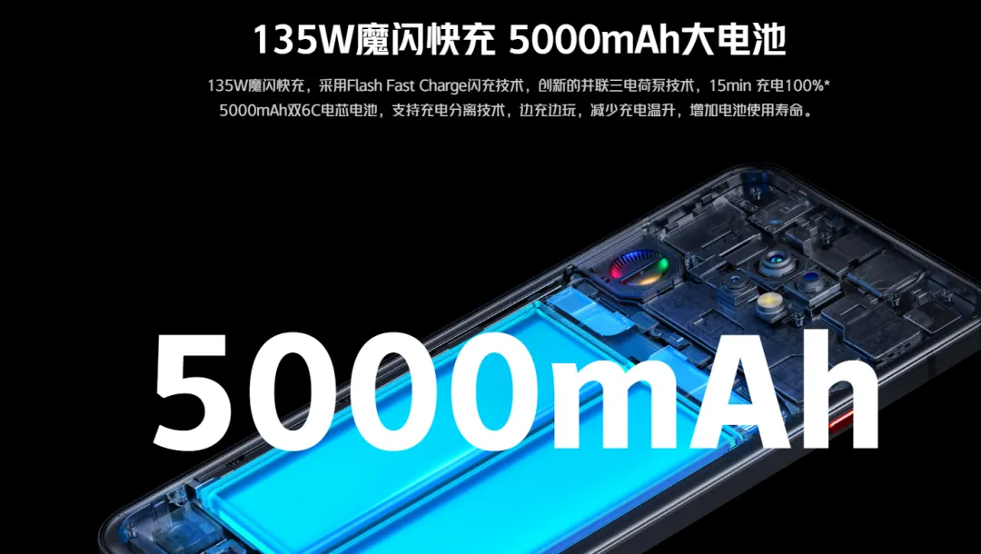 – 续航:5000mAh 双 6C 电芯电池,支持 135W 快充(并联三电荷泵),15 分钟完全充满,标配 165W 氮化镓充电头