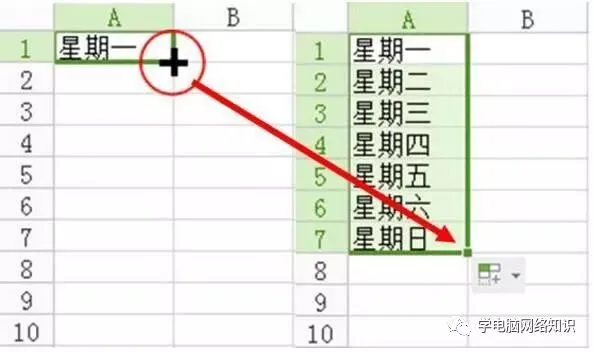 功能描述:速通过拖拉填充柄的方式产生平时常用序列。