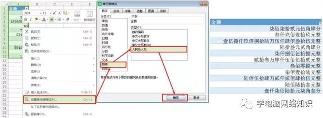 操作步骤:选中金额数据单元格→右击鼠标→选中设置单元格格式→特殊→人民币大写