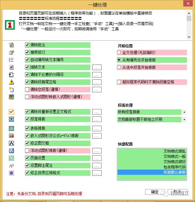 (3)提供一键处理功能,极大简化用户操作。轻松应对格式混乱的文档,如果格式已经较好,可以 有选择使用分步处理,如:单独对段落、标题或表格等进行处理。处理范围还可以限定区域或全文。