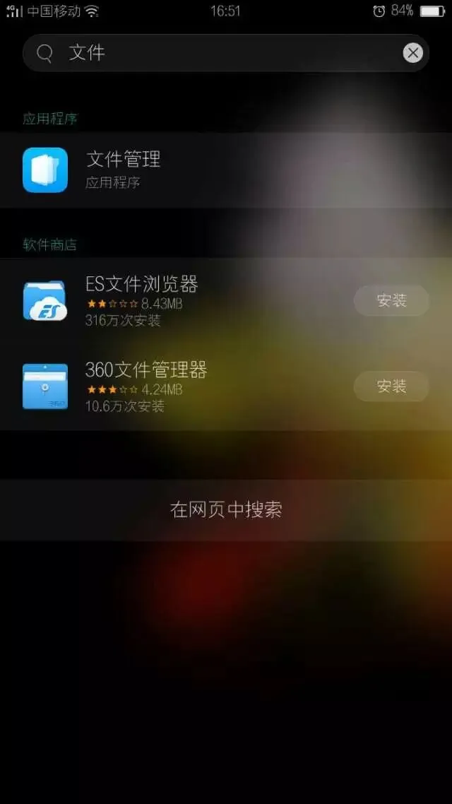 软件太多找不到?!ColorOS3.0新增下滑搜索功能,亮屏解锁状态下,在屏幕中部轻轻下滑,即可进入搜索界面,只需所有文件管理即可找到该应用。